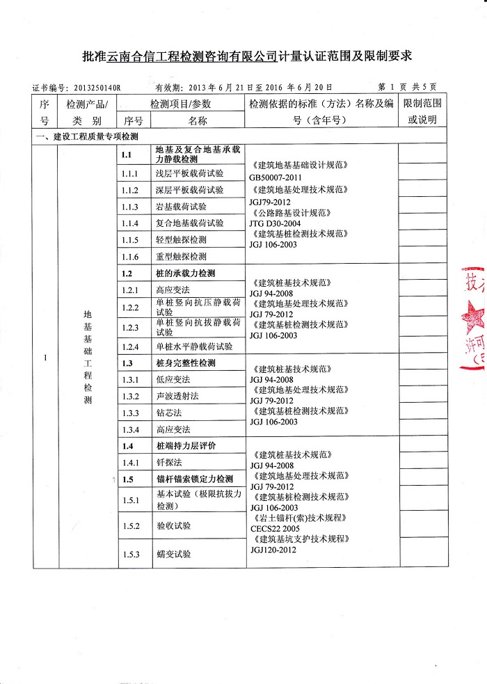 云南合信工程檢測(cè)咨詢有限公司地基基礎(chǔ)工程檢測(cè)主要能力為: