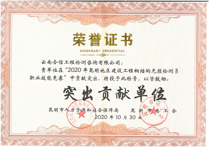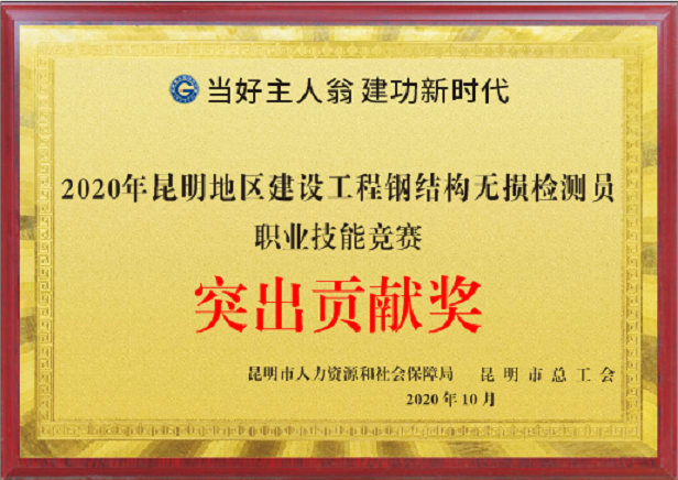 同時,我司作為技術支持單位協(xié)助云南省工程檢測協(xié)會舉辦了2020年昆明地區(qū)建設工程鋼結(jié)構(gòu)無損檢測員職業(yè)技能競賽活動。此次技能競賽選拔出了一批技藝精湛、善于解決技術難題的技術尖兵,不僅使檢測機構(gòu)有效地判斷自身鋼結(jié)構(gòu)無損檢測的水平,取長補短,也促進昆明市地區(qū)建筑工程檢測行業(yè)鋼結(jié)構(gòu)檢測整體水平的提升。在此次技能競賽活動中我司提供了大力支持、表現(xiàn)突出,因此獲得了由昆明市人力資源和社會保障局、昆明市總工會頒發(fā)的突出貢獻獎獎牌和榮譽證書。