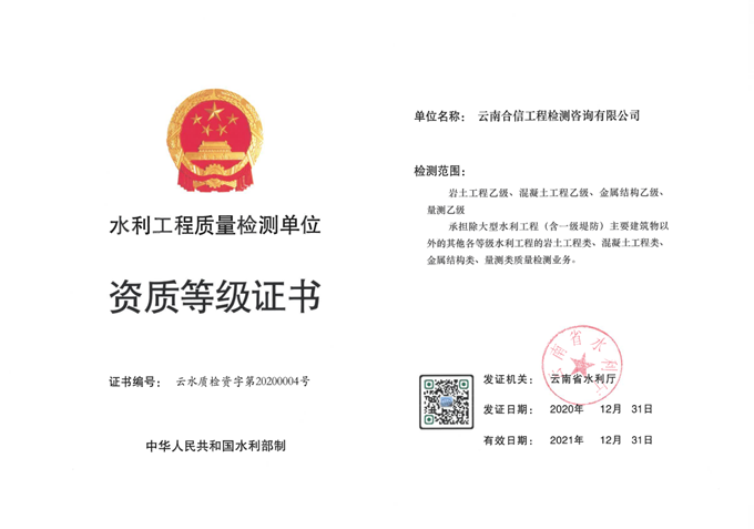 國檢集團(tuán)•云南合信公司喜添水利工程質(zhì)量檢測乙級資質(zhì)