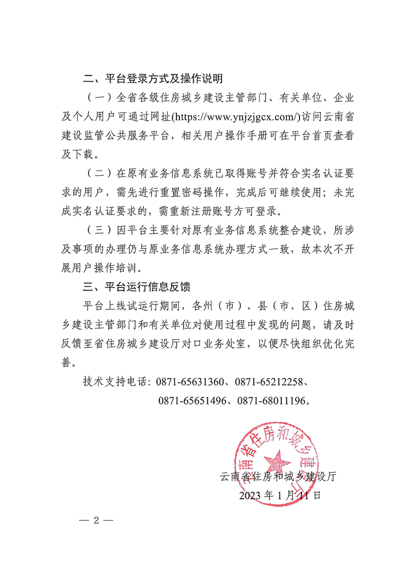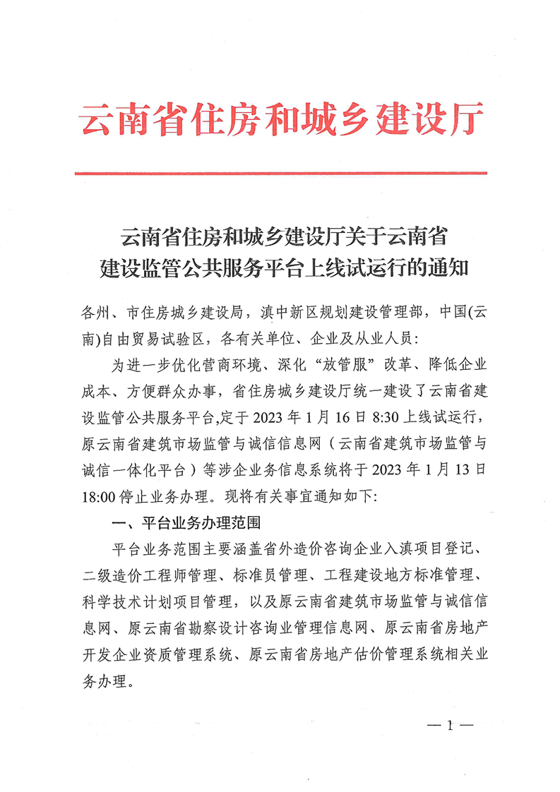 云南省住房和城鄉(xiāng)建設廳關于云南省建設監(jiān)管公共服務平臺上線試運行的通知